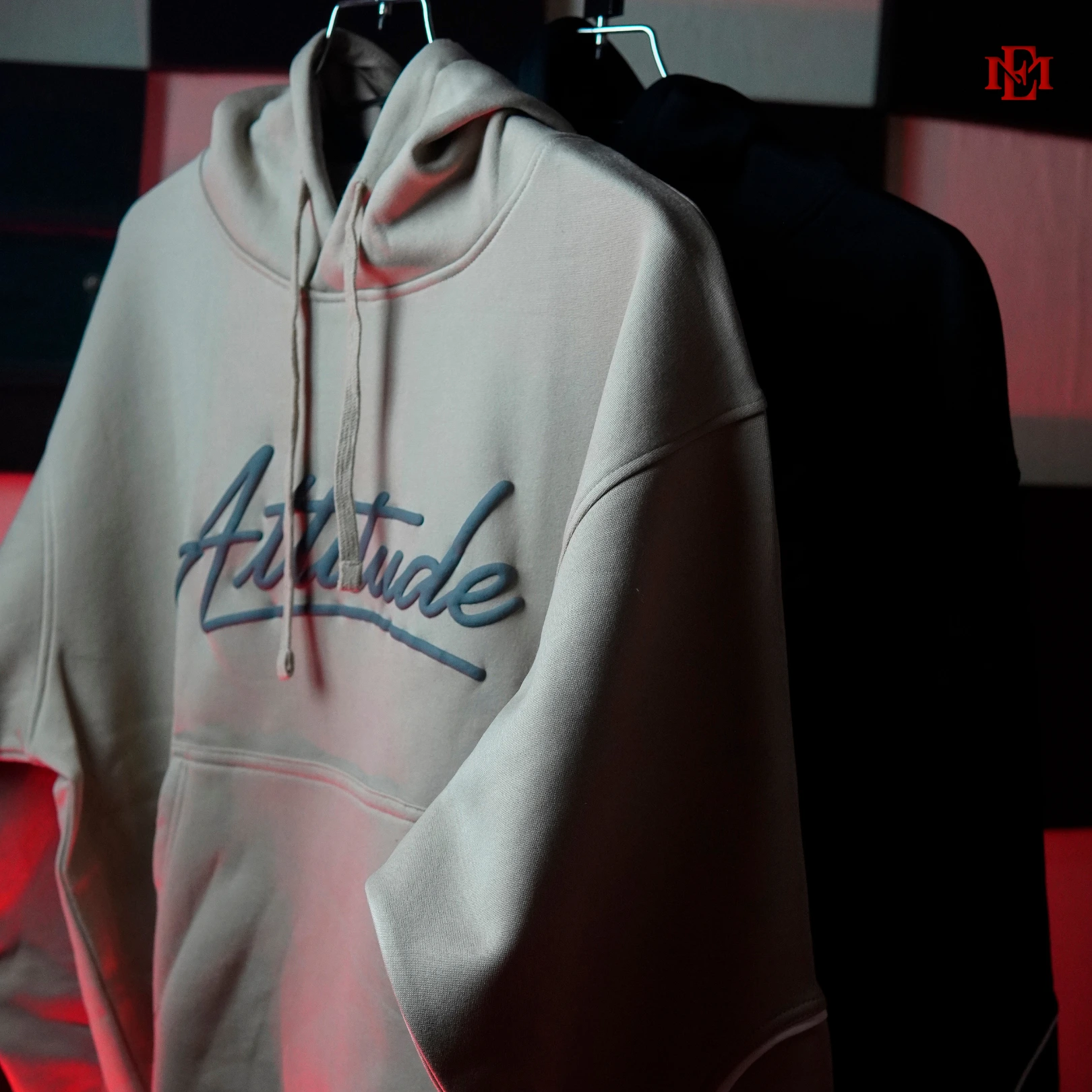 Crafted from 320+ GSM inside-brushed polyester fleece, it features a drop shoulder boxy fit, bold puff print “ATTITUDE” on the front, and “ESMORE” branding on the sleeve.