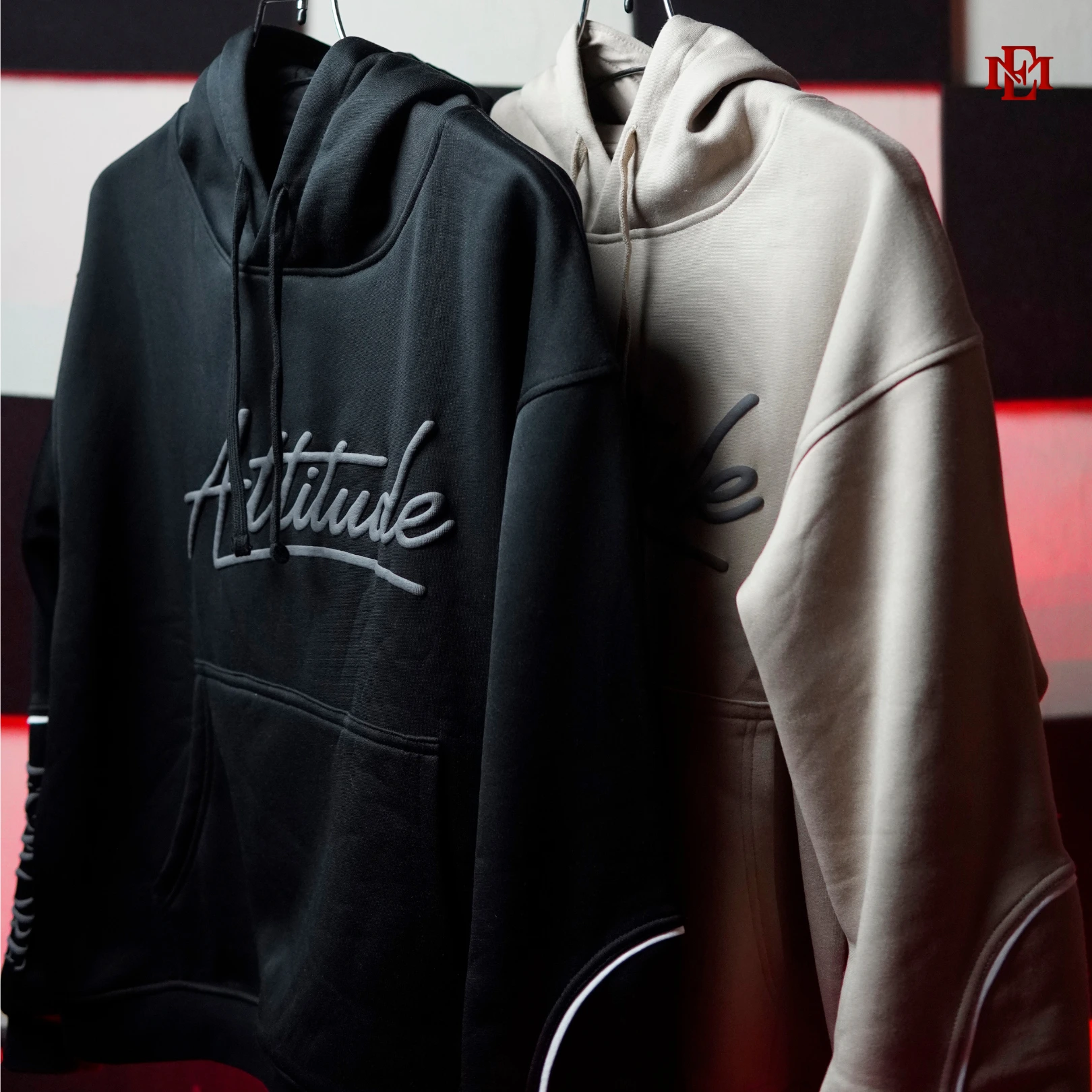 Crafted from 320+ GSM inside-brushed polyester fleece, it features a drop shoulder boxy fit, bold puff print “ATTITUDE” on the front, and “ESMORE” branding on the sleeve.
